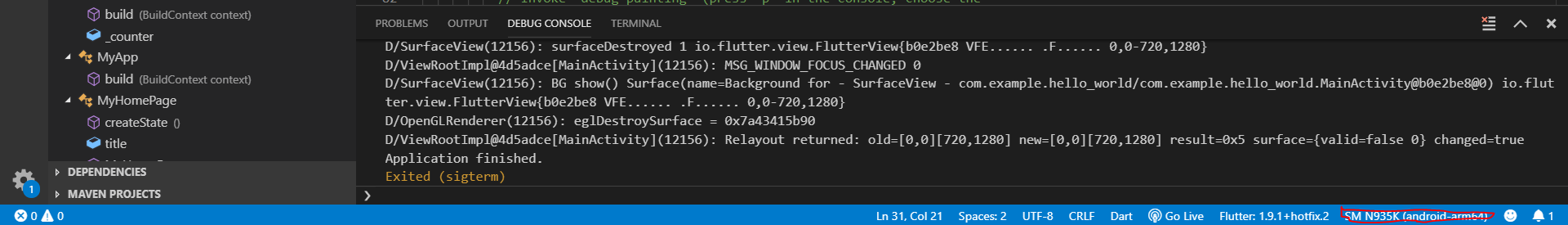 (1) VSCode Editor아래 상태바에서 앱을 실행시킬 device를 선택합니다.