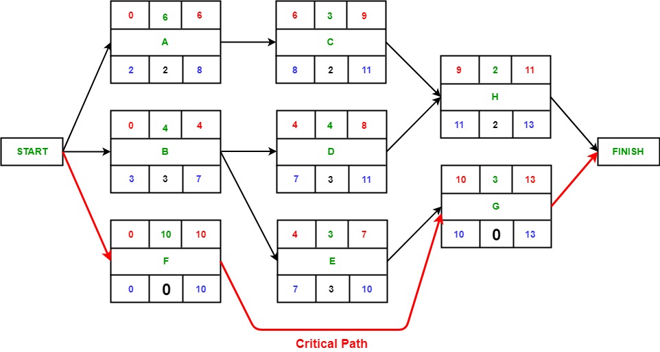주 경로(Critical Path) 같은 경우 여유시간(Float)이 0인 주 작업(Critical Task) 작업들의 경로이며 해당 작업이 늦춰질 경우 프로젝트 전체가 지연되는 결과가 발생한다.